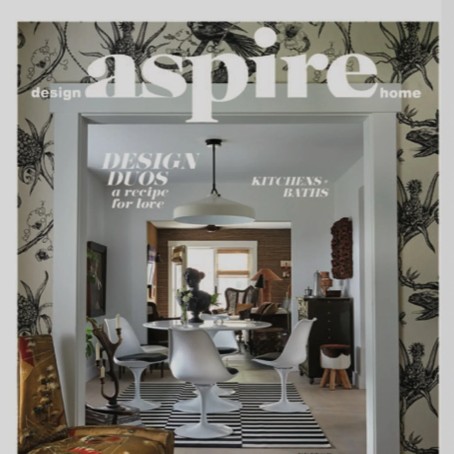 A black wooden china cabinet with glass doors, filled with glassware and decorative items, set against a wall with patterned curtains. Overlaid text reads 'AND ARCHITECTURAL DIGEST'.