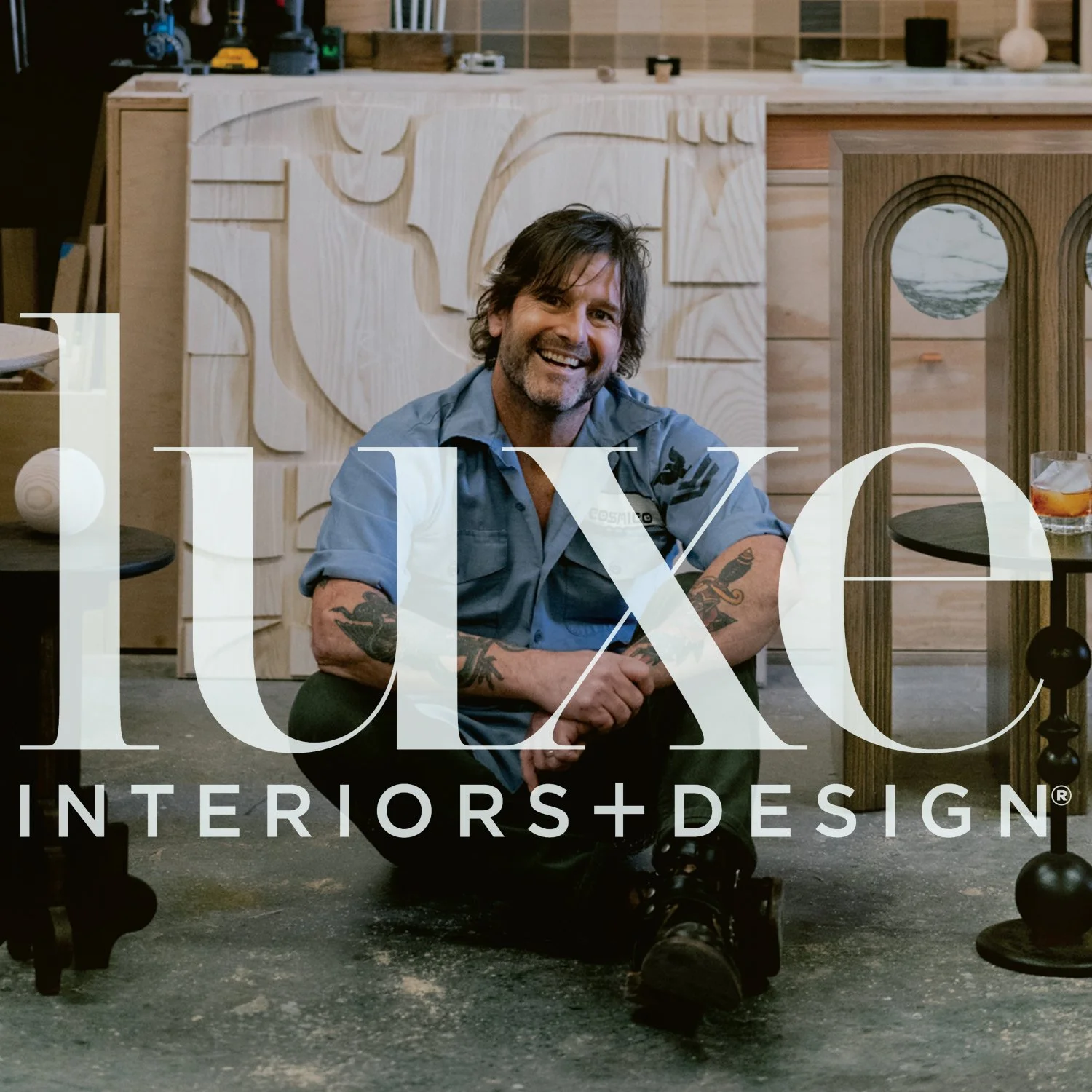 A smiling man with tattoos sitting on the floor in a woodworking or interior design workshop, surrounded by wooden furniture and decor pieces, with the overlay text 'Luxe Interiors + Design'.